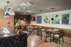 Kapacita priestoru s rozlohou 80 m2 je 20 miest na sedenie, s možnosťou pridania 10-tich barových stoličiek a sklenených stolov.