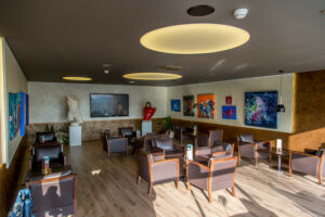 Interiér inšpirovaný aristokratickými anglickými klubmi, v ktorom organizujeme pravidelné výstavy obrazov, fotografií a sochárskeho umenia si vás ihneď získa. K dispozícii máte TV obrazovku s HDMI pripojením, ako aj profesionálne stropné ozvučenie priestorumikrofón.